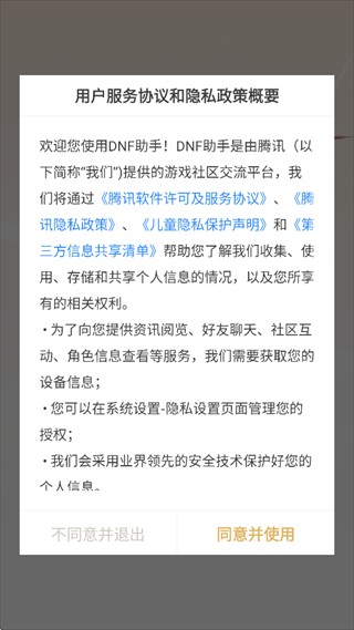 1、打开DNF助手APP后,仔细阅读用户服务协议和隐私政策概要,确认无误后点击【同意并使用】继续。