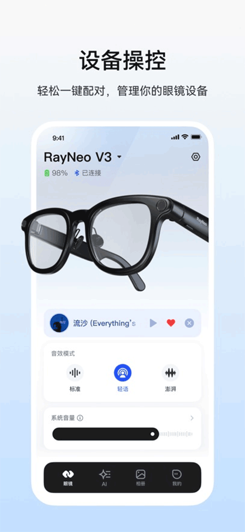 雷鸟AR眼镜融入了全新的未来科技,提供了专业的手机和眼镜的智能连接的方式,让我们所有用户都可以快速的绑定眼镜,通过智能操作就可以快速的对眼镜的各种功能进行方便的适配,还有着十分简约的ui界面,让我们使用ar眼镜的时候更加的轻松简单,而且能够保证连接的稳定性,想要体验未来科技的小伙伴欢迎点击下载下来吧。