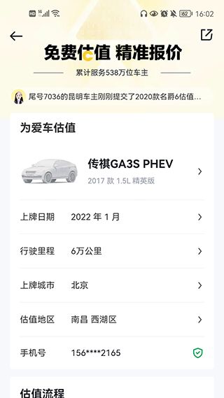 5、填写与车辆相关的详细信息后,点击【免费估价】,接着点击【获取验证码】,输入收到的验证码,再次点击【免费估价】即可完成估价。