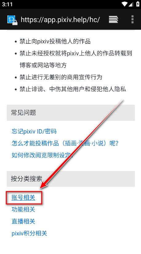 3、进入后点击“账号相关”,查看与账号操作相关的内容。