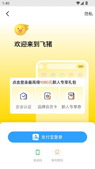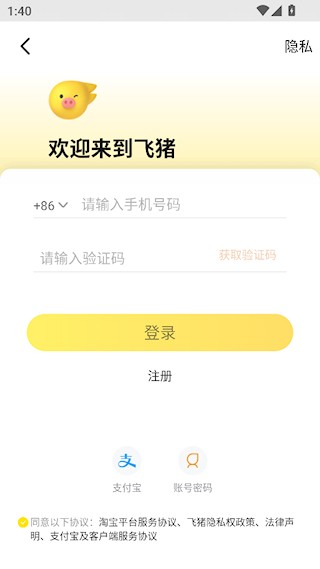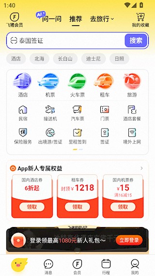 1、打开飞猪旅行最新版APP,点击底部的“立即登录”。