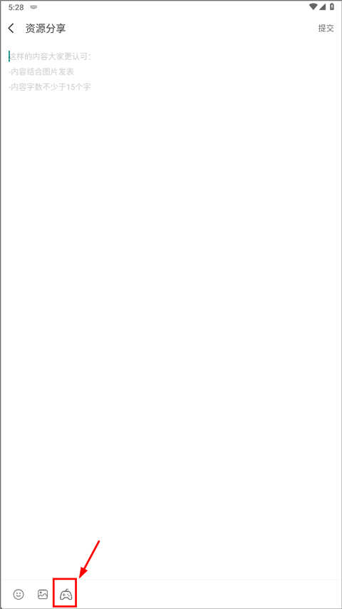 3、在资源分享页面输入文字内容,然后点击下方的“游戏手柄”图标;
