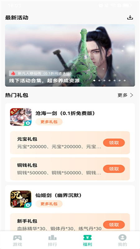 1、首先打开手机里的逍遥市场app,首页会展示大量热门游戏的特殊版本和BT版本,用户可以直接下载安装,同时还有丰富的礼包可以领取。