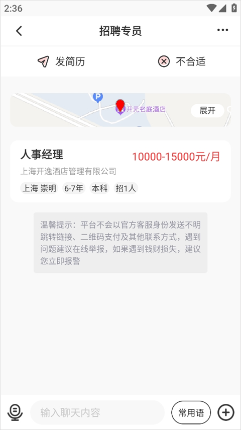 3、在此页面可直接 “发简历” 投递,或先与招聘方沟通。