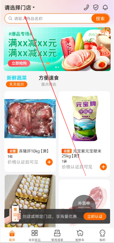 1、用户登录菜优汇软件后,可以直接在首页点击选择门店,开始创建流程。