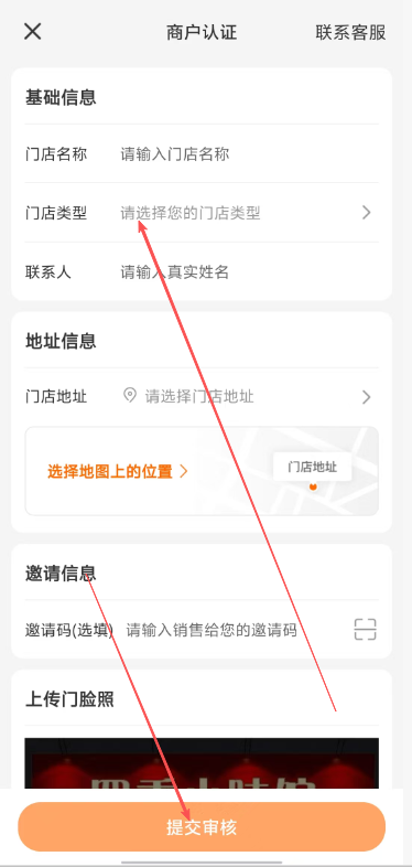 3、在商户认证页面,填写基本信息、地址信息、邀请信息以及门店照片等内容,完成后点击提交审核即可。