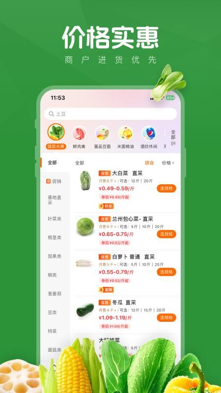 2、支持按类别浏览食品配料,涵盖蔬菜、水果、肉类、粮油、干货等,提供一站式采购。