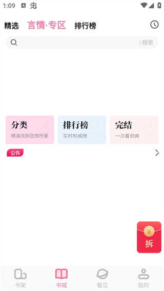 1、点击废文网海棠书屋软件主页面,上方有三个主要选项,分别是【精选】、【言情专区】以及【排行榜】,方便用户快速浏览内容。