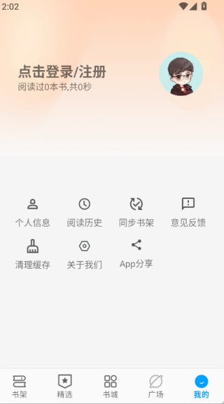 4、点击我的,进行登录或注册,即可使用个人信息管理、阅读历史记录、同步书架以及意见反馈等功能,提升用户体验。