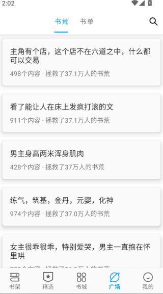 3、点击广场,提供书荒推荐和书单服务,点击任意一项即可进入查看和使用,满足不同阅读需求。