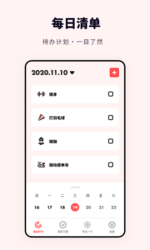 2、每日登记可一键完成。进度条显示累积天数和完成状态,使进度可见。