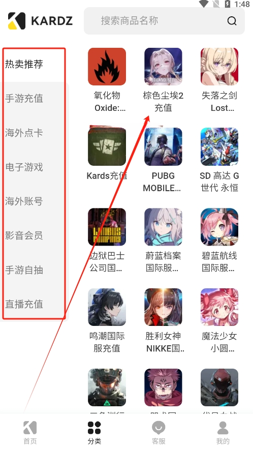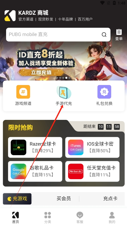 1、下载本网站提供的Kardz商城软件资源,在首页找到“手游代充”入口。