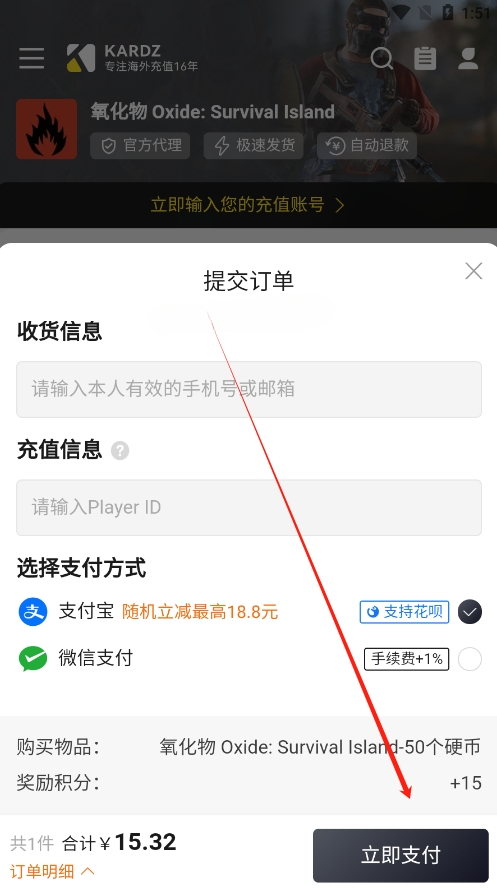 5、填写完整有效的收货信息和充值信息,选择支付方式后提交订单,等待平台将充值金额到账即可。