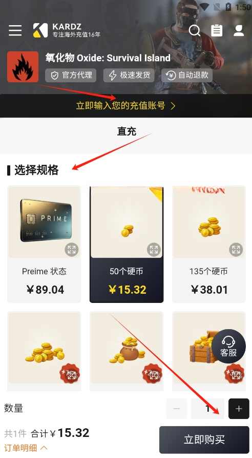 4、输入充值账号信息,选择所需规格,然后点击“立即购买”。