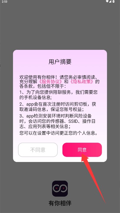 1、初次使用时需要先阅读用户协议和隐私政策,确认没有问题后,点击同意按钮即可进入登录界面。