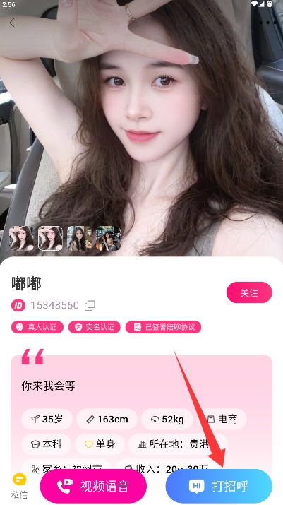 4、在用户资料页面可以查看对方的更多信息,点击“打招呼”功能,就能开始与该用户聊天交友。