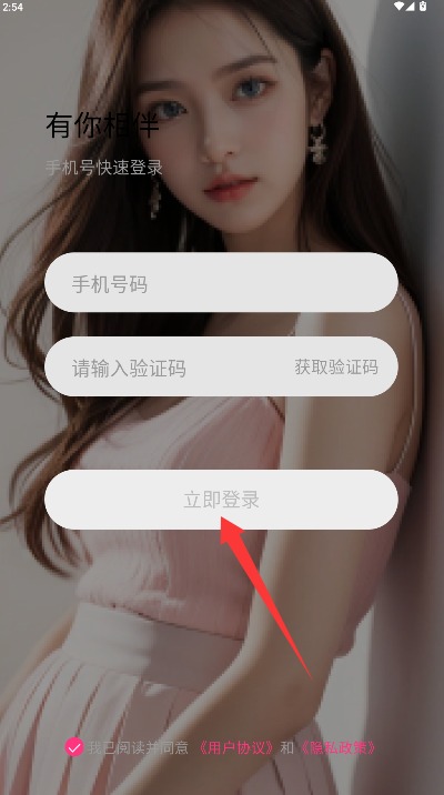 2、在有你相伴交友平台登录界面输入手机号和收到的短信验证码,勾选同意相关协议后,点击“立即登录”即可进入应用。