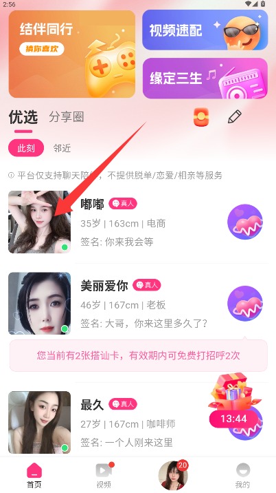 2、智能视频速配功能,根据你的约会信息,帮你找到最合适的人,并支持视频聊天。