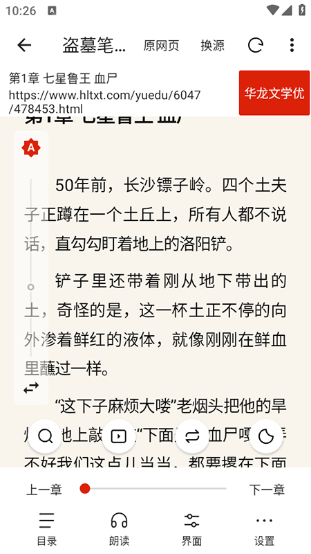 3、阅读过程中,如果需要调整相关设置,可以点击屏幕中间唤出菜单,从中进行章节切换、开启朗读功能或调整屏幕方向等操作。
