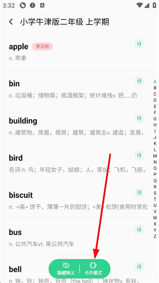 3、选择小学牛津版二年级上学期单词本后,进入单词列表页面,你可以查看每个单词的释义,还可以使用隐藏释义、卡片模式等辅助学习功能来加深记忆。