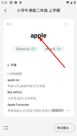 4、点击单词进入详情页后,你将看到该单词的英美式发音、详细释义,以及相关的词组和短语等拓展内容。点击【完全展示】即可查看该单词的更多相关信息。