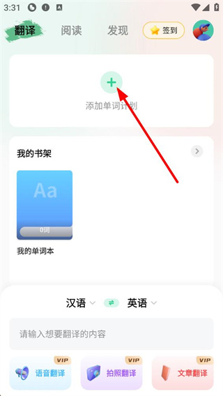 1、进入英语翻译君的翻译功能页面后,你将看到【添加单词计划】按钮和【我的书架】板块,同时可以切换不同的语言进行翻译,还配备了语音翻译和其他VIP专属翻译功能。