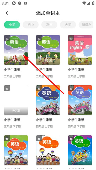 2、点击【添加单词计划】后,进入添加单词本的页面。这里按学段分类,包括小学等多个阶段,提供了小学牛津版不同学期的单词本,每个单词本上都标注了相应的单词数量。