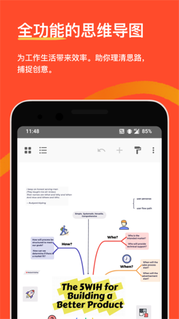 2、该软件为用户提供独家的思想导入,使他们能够快速创建他们的思想和想法的思维导图。