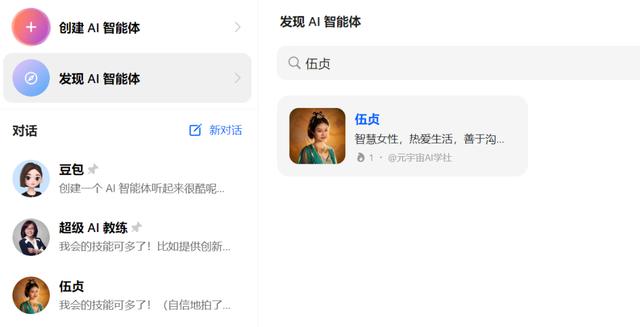 打开豆包,点击“发现智能体”,然后搜索你的角色名字(例如“伍贞”),就可以开始互动了。