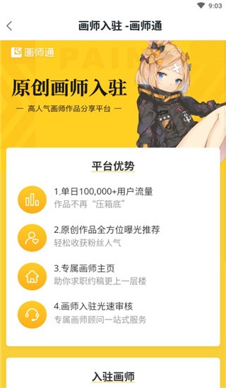 4、点击【画师入驻】,即可立即开始入驻触站,上传作品并展示自己的创作。