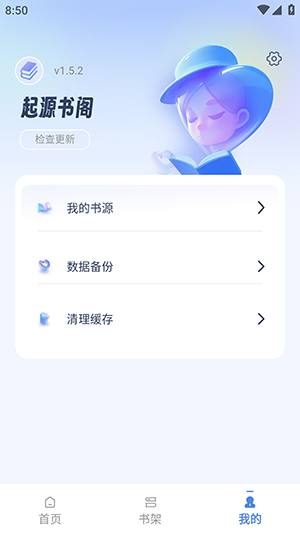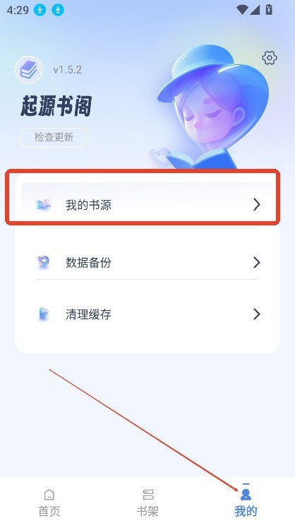 1、进入起源书阁纯净版【我的】页面后,点击【我的书源】选项。