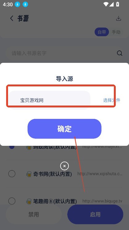 4、在弹出的输入框中输入书源地址,自行添加自定义书源。