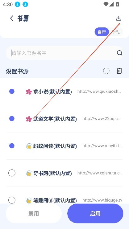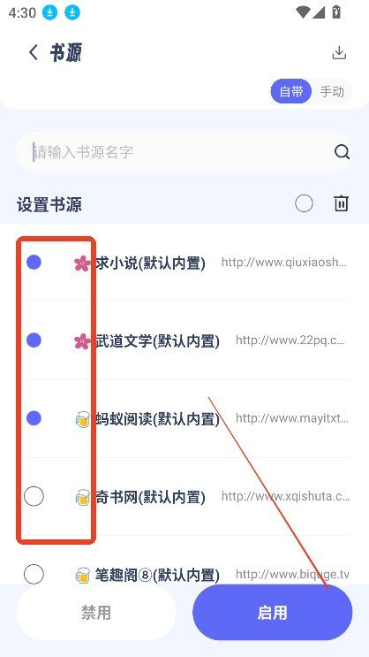 2、选择你想使用的书源,勾选后点击启用按钮即可。