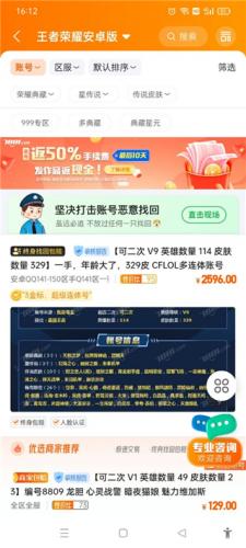 3、以王者荣耀为例,点击进入后,您可以查看卖家发布的各类游戏账号信息。