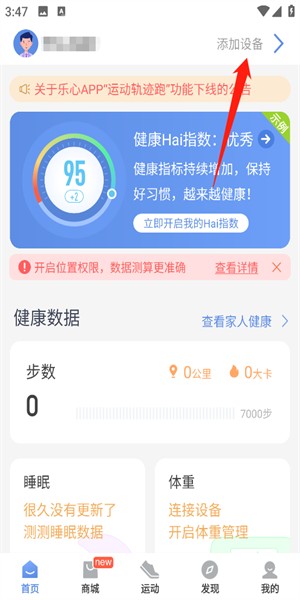 1、首先打开乐乐心健康app,然后在首页找到并点击“添加设备”选项。