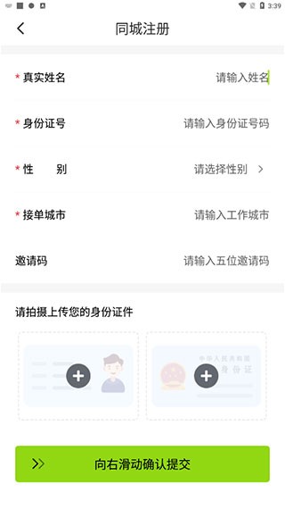 3、按照提示填写姓名、身份证号、性别、接单城市,然后拍照上传身份证并提交,审核通过后即可开始接单。