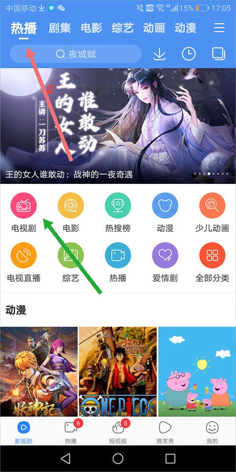 1、打开特狗影视大全免费观看APP,进入【影视剧】页面,然后切换到顶部导航栏中的【热播】分页(可参考下图红色箭头所示位置),再点击【电视剧】(下图绿色箭头所示位置)。