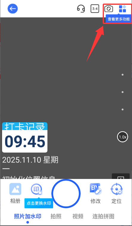 2、在万能水印相机修改时间主界面中选择“查看更多功能”,即可跳转到工具选择页面。