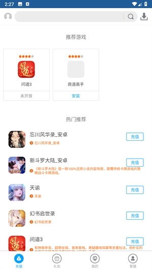 1、打开游团手游盒子软件进入游戏充值页面,这里会推荐多种游戏,玩家可以选择自己喜欢的游戏进行充值。