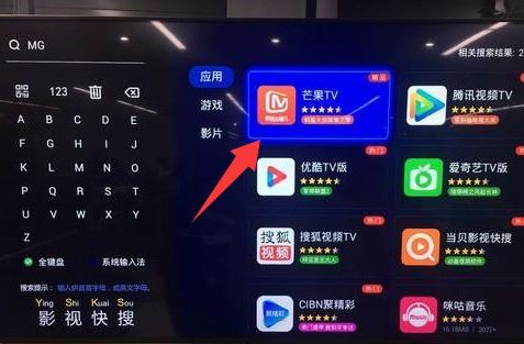 1、在智能电视上打开当贝应用市场,并在搜索框输入“MGTV”进行运行。