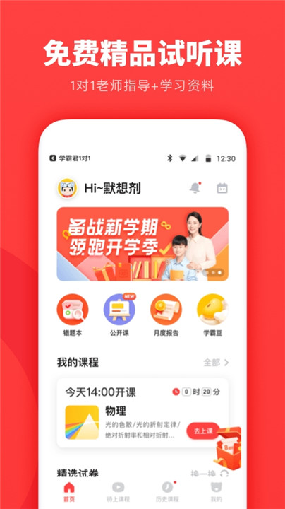 学霸君1对1最新版是一款能够提供高效的在线学习方式的免费学习软件,涵盖了海量不同类型的精品课程资源,各种学科类型也很丰富,想要学习什么最新的课程资源都可以在这里轻松学习,同时通过科学的兴趣学习方式让我们的学习成绩可以快速的提升,让学习变得更加简单,还有海量的优质题库可以让我们轻松刷题,感兴趣的小伙伴欢迎点击下载下来吧。