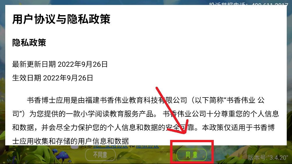 1、下载并打开书香博士最新版本软件后,先仔细阅读用户协议,如果没有异议,再点击同意。