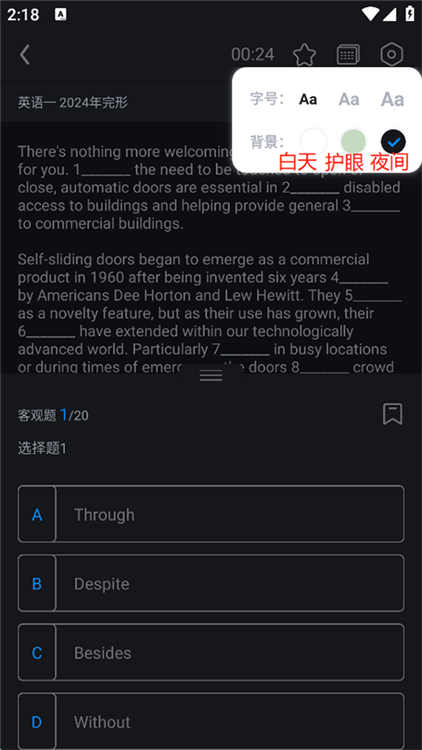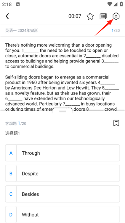 1、打开星火英语高中3500词电子版APP,在做题界面,点击右上角的设置图标;