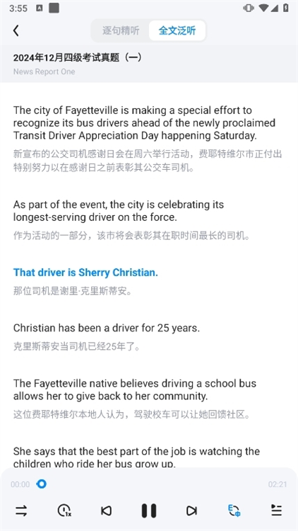 3、扫描成功后,界面会自动跳转到与试卷匹配的音频,或者进入名师视频、常用词汇、全真考场等内容,这些都是根据你扫码的二维码直接跳转的。