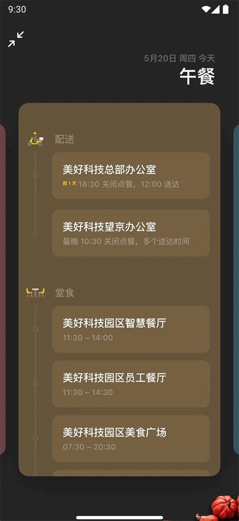 3、配送&堂食:美餐外卖配送时间清晰可见,同时提供多种堂食地点可供选择。