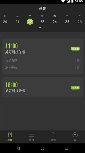 1、支持一次性预订下周餐食,彻底告别日常点餐烦恼,日历格式直观地显示预订的餐食,一目了然。