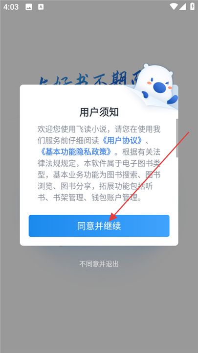 1、第一次打开飞读小说免费版时,会弹出用户协议和隐私政策页面,需要认真阅读后点击同意才能继续使用,这一步是为了让用户明确了解并认可平台对个人信息的使用规则。