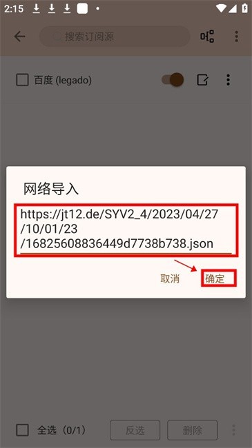 4、在本站本页面的特别说明部分,复制其中一条书源链接(可随意选择),然后粘贴到弹出的【网络导入】框中,点击【确定】完成操作。