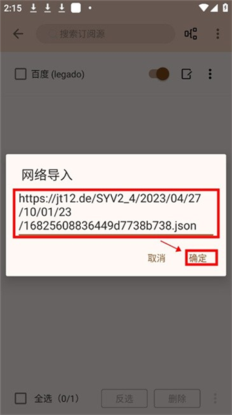 4、在本站本页面的特别说明区域,复制其中一条书源链接(可随意选择),将其粘贴到弹出的【网络导入】框中,然后点击【确定】。