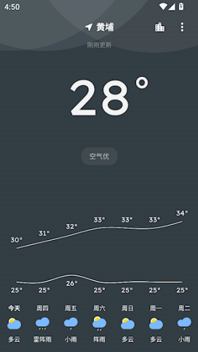1、在本站下载安装完成后,打开pure天气pro8.5.5版app进入主界面,可以看到未来一周的天气趋势,向下滑动还能查看更多详细信息。